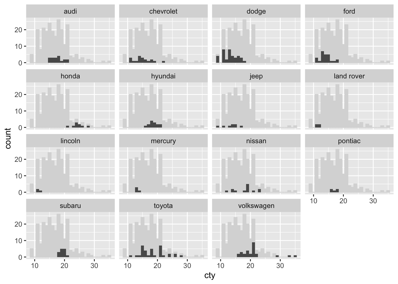 data = transform(mpg, manufacturer = NULL), fill = "grey85",