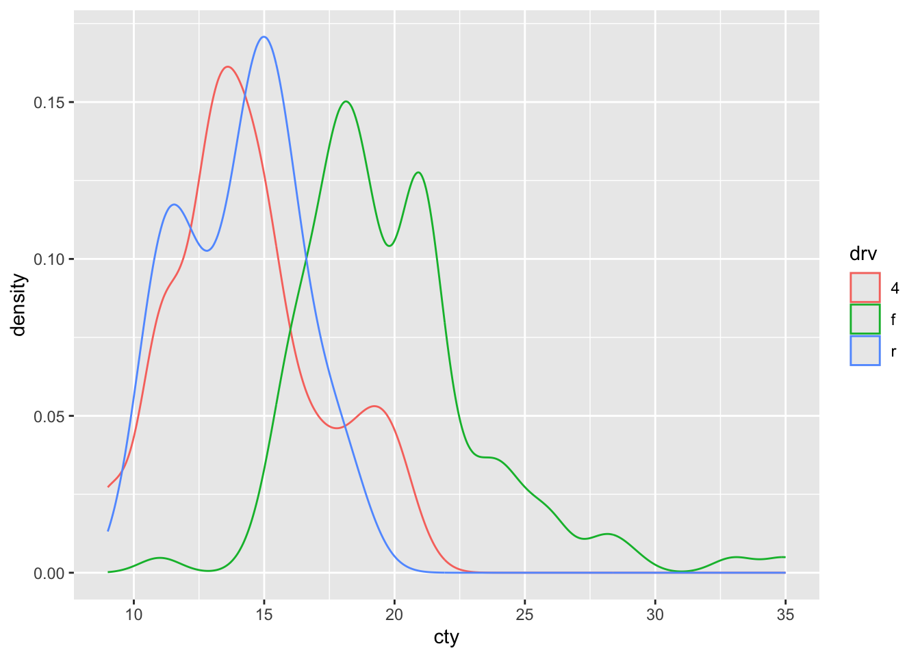 ggplot(mpg, aes(x = cty, colour = drv)) +