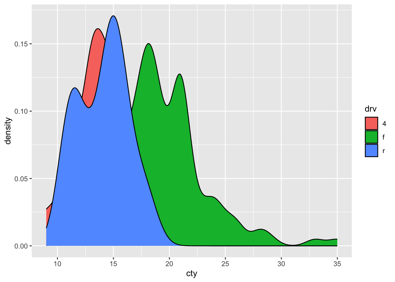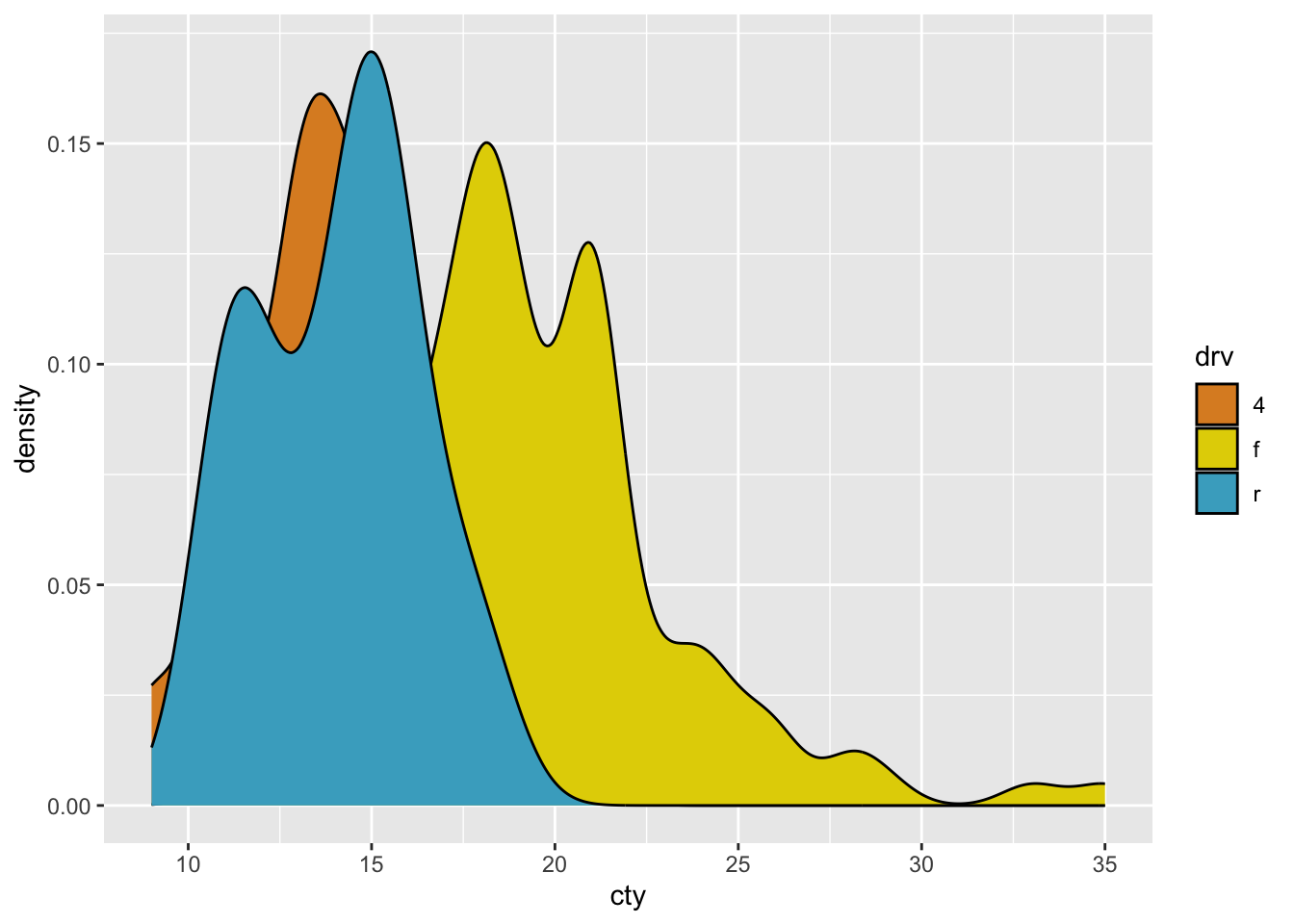ggplot(mpg, aes(x = cty, fill = drv)) + geom_density() +