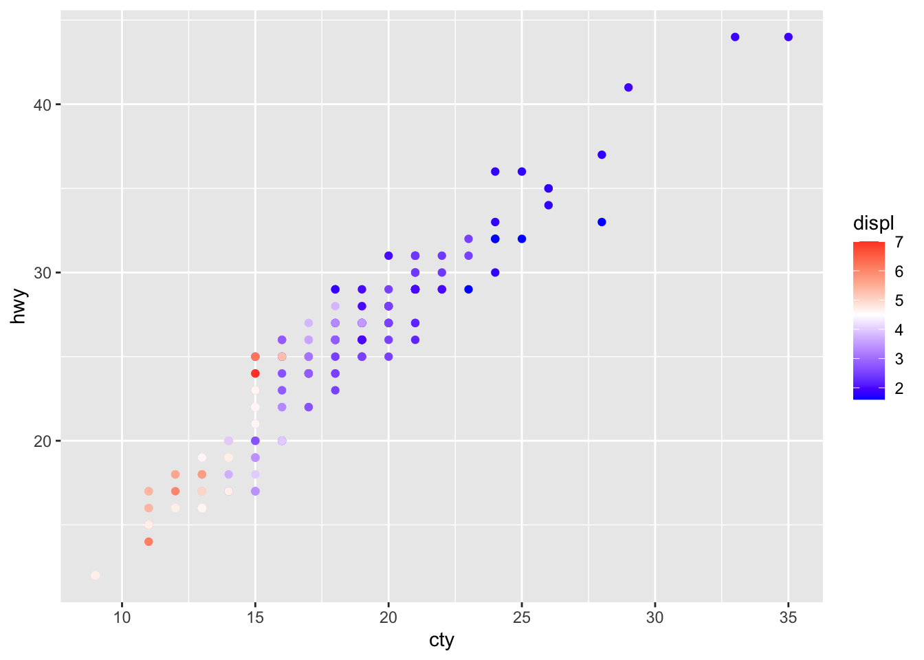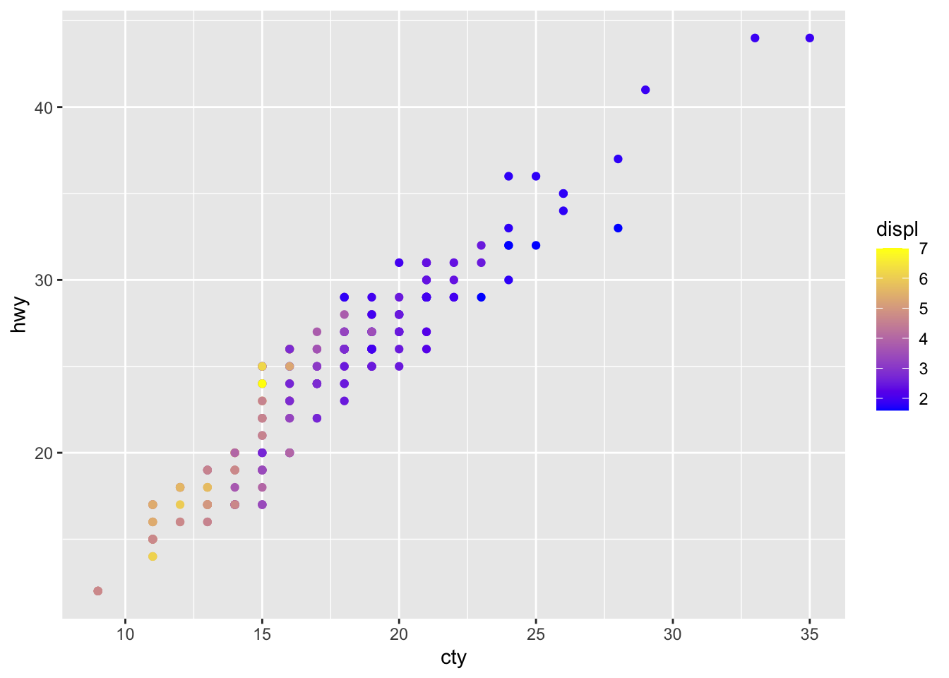 ggplot(mpg, aes(x = cty, y = hwy, colour = displ)) +