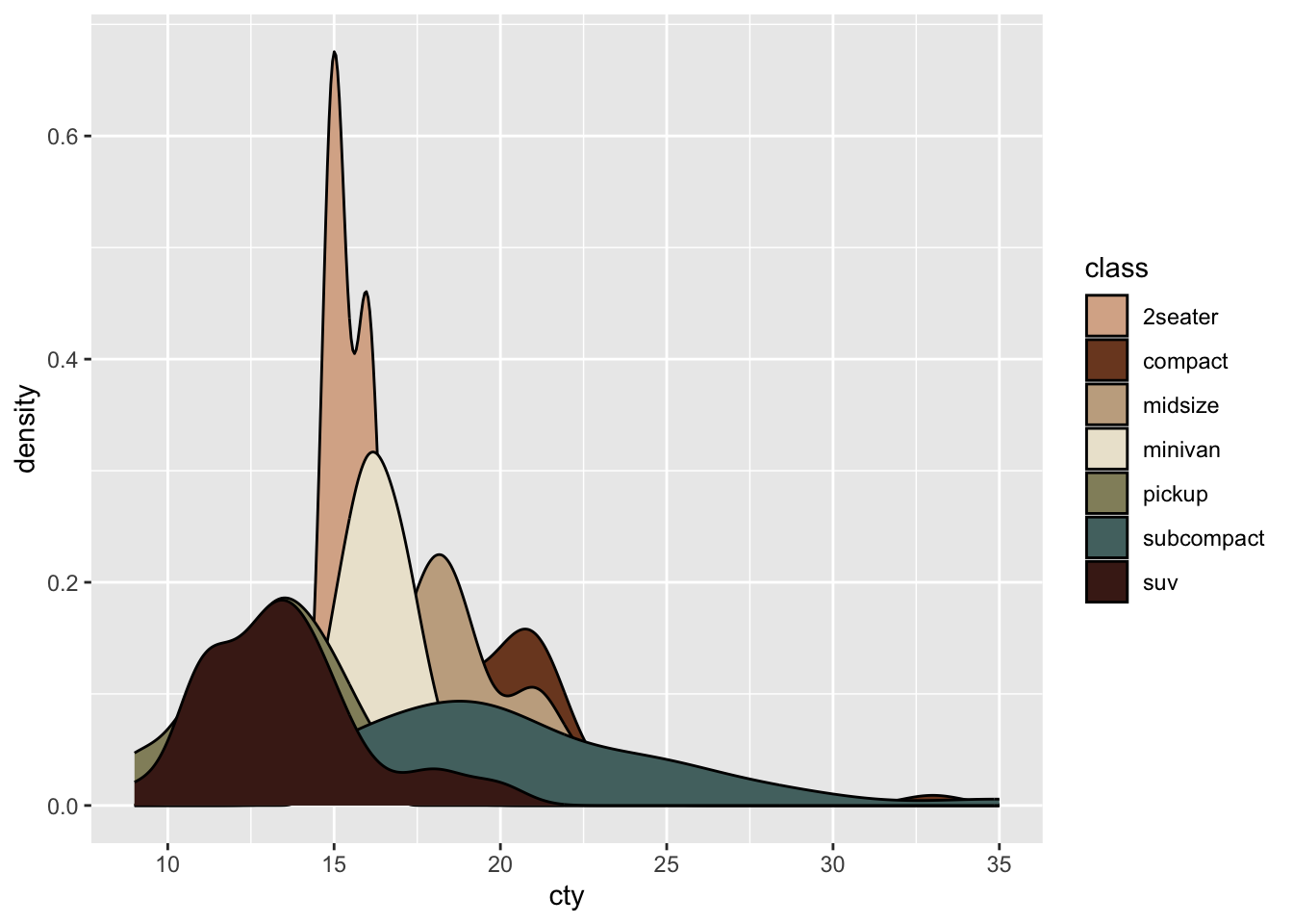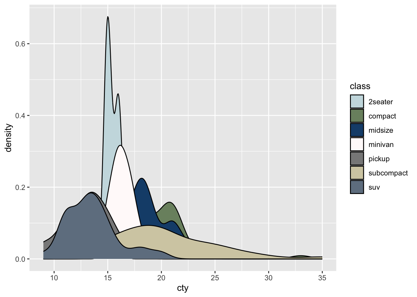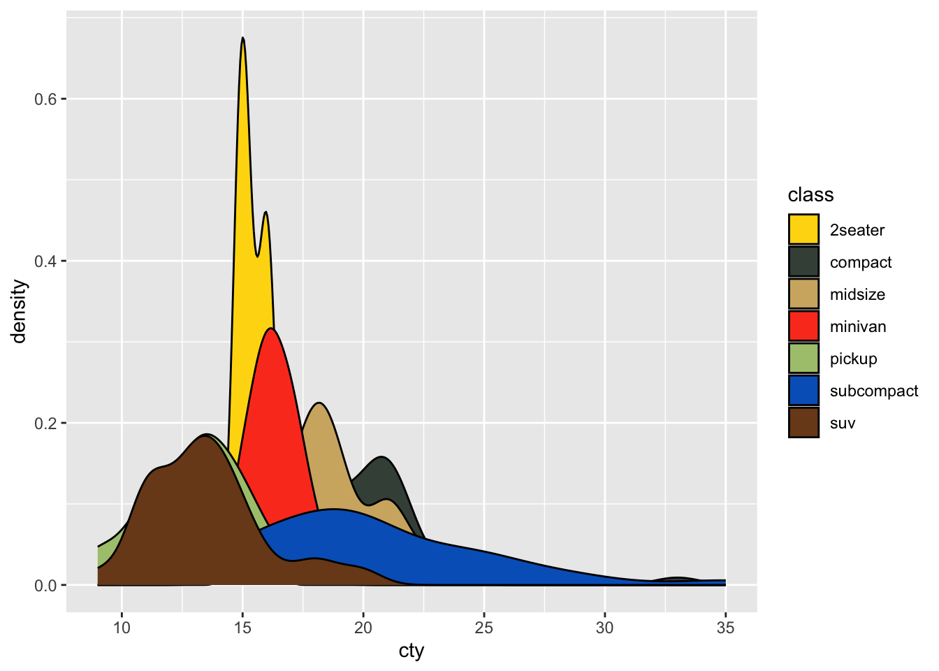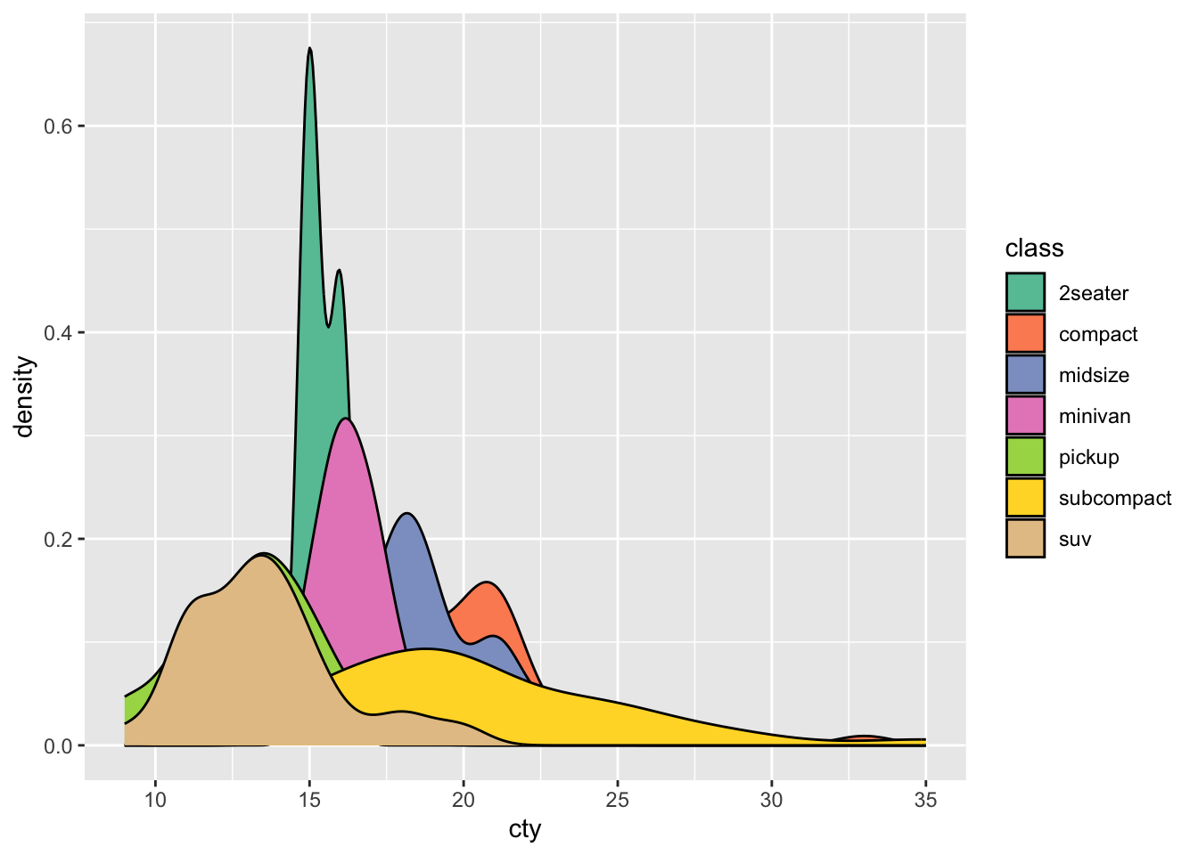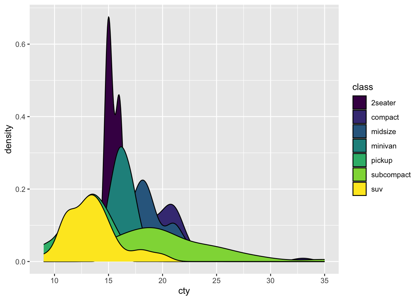 ggplot(mpg, aes(x = cty, fill = class)) +