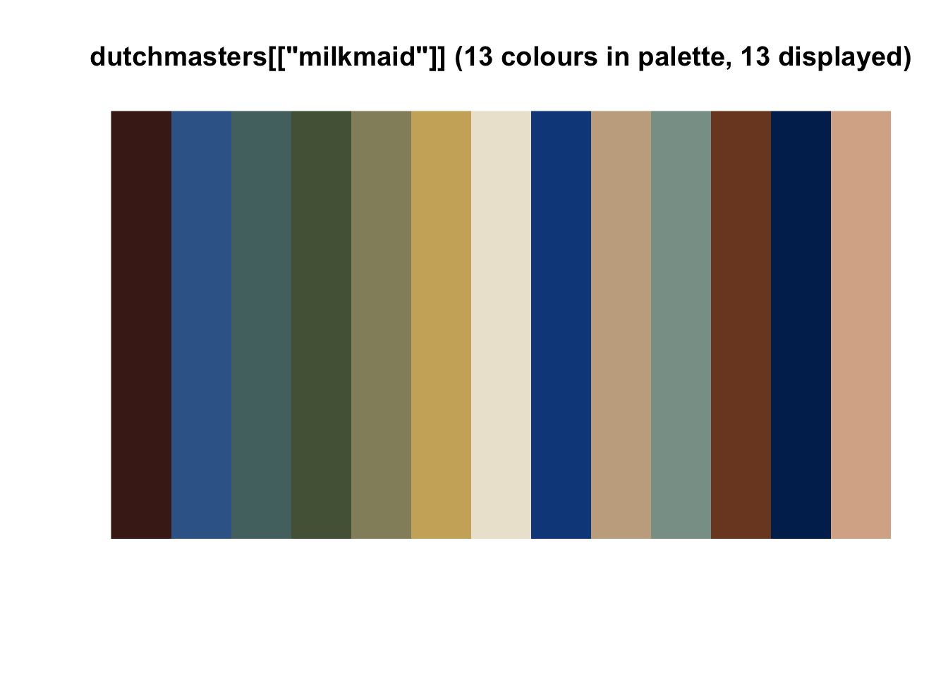 library(dutchmasters)Let’s see the colour palette for Het melkmeisje from Johannes Vermeer