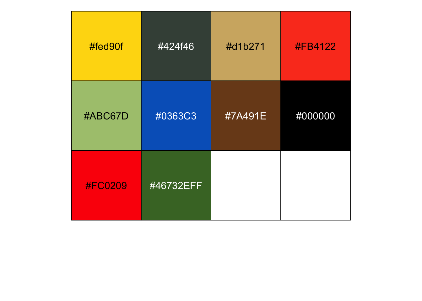 # scales::show_col(tvthemes:::gravityFalls_palette)