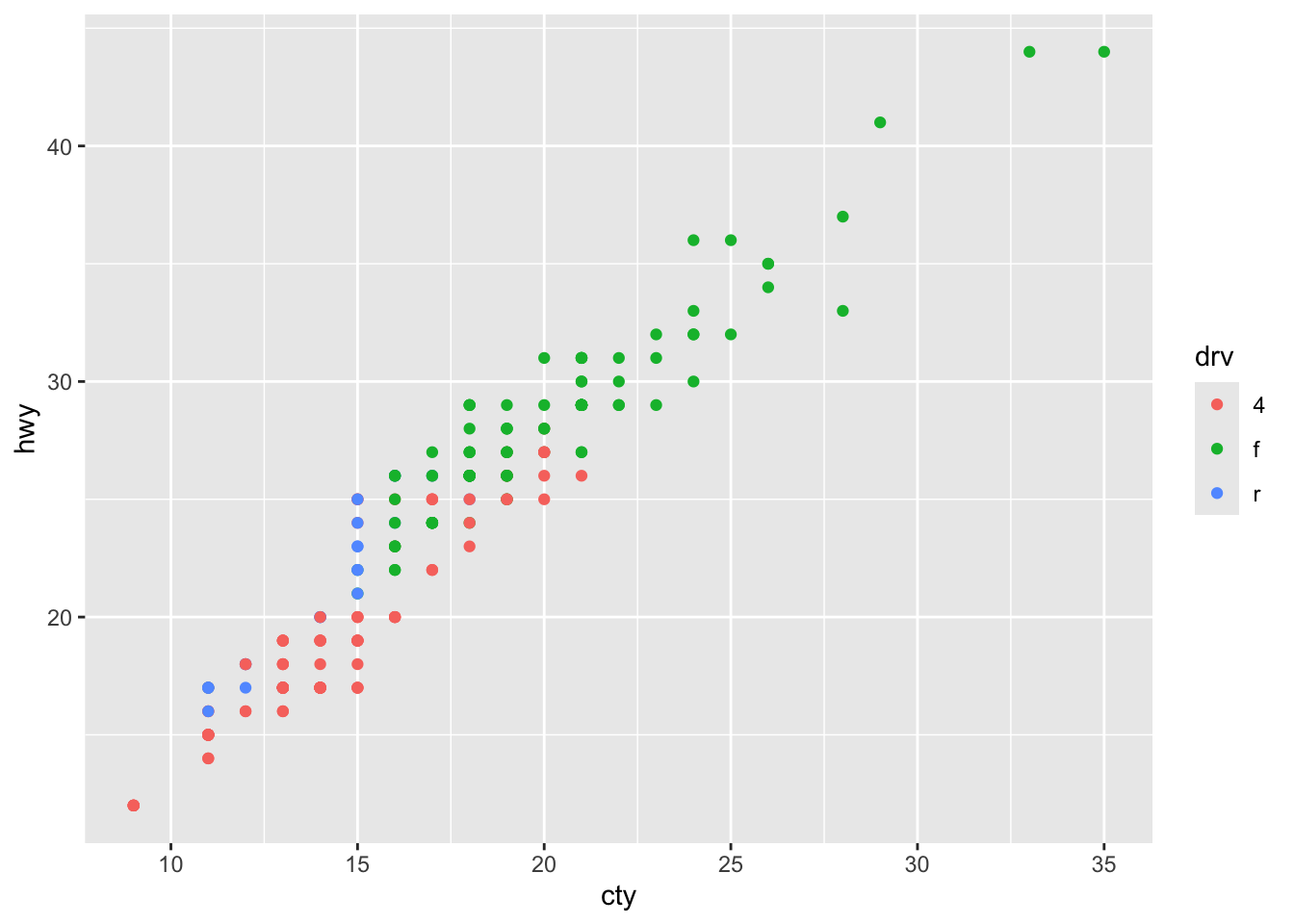 The data(set) here is ‘mpg’. The data will be represented by points (the geom). We have mapped the variables in the data to visual properties of the geom, the aesthetics; in this case the x- and y-location (based on variables cty and hwy that exist in mpg) and a colour (based on the variable drv). We haven’t specified a coordinate system, so ggplot takes the default Cartesian coordinate system (but other options are available!).