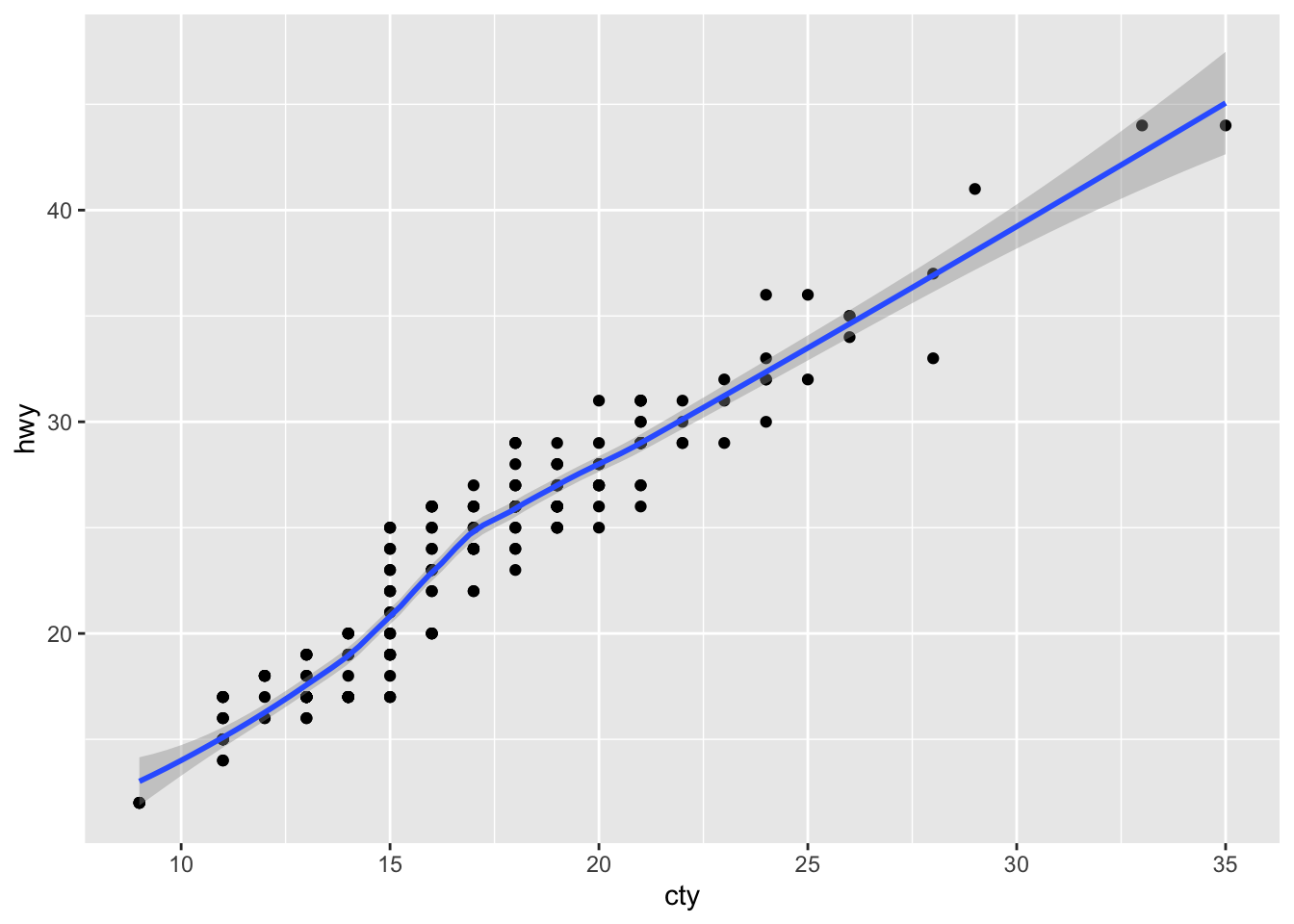 mpg is the name of the dataframe and includes data on types of cars and their use of fuel. cty refers to a variable in the data (in mpg), namely how many miles the car can drive per gallon of fuel in a city. hwy also refers to a variable in the data (in mpg), namely the miles per gallon on a highway.