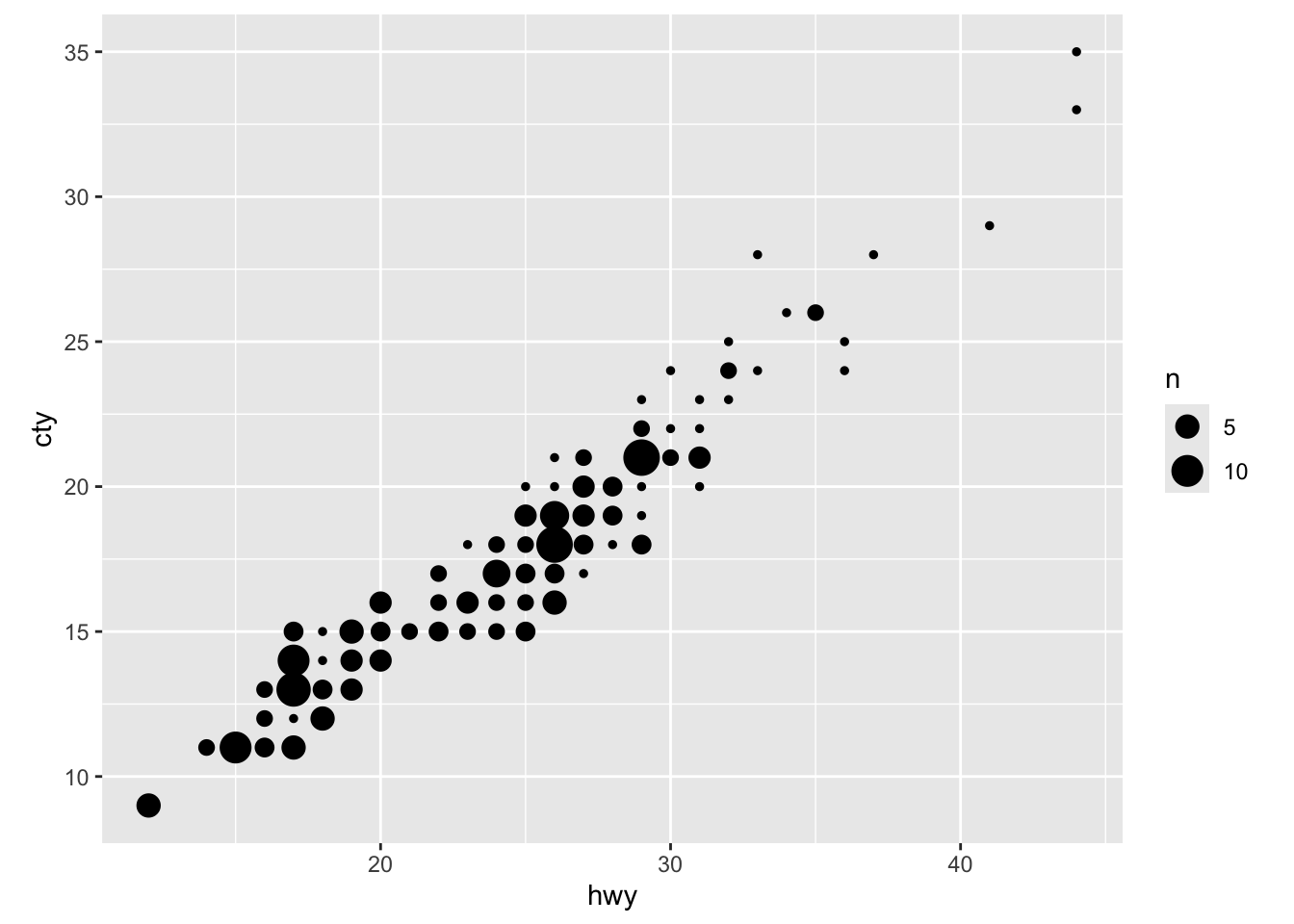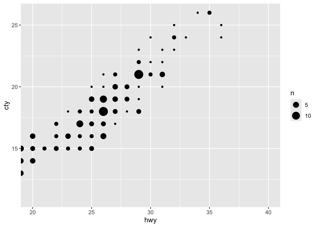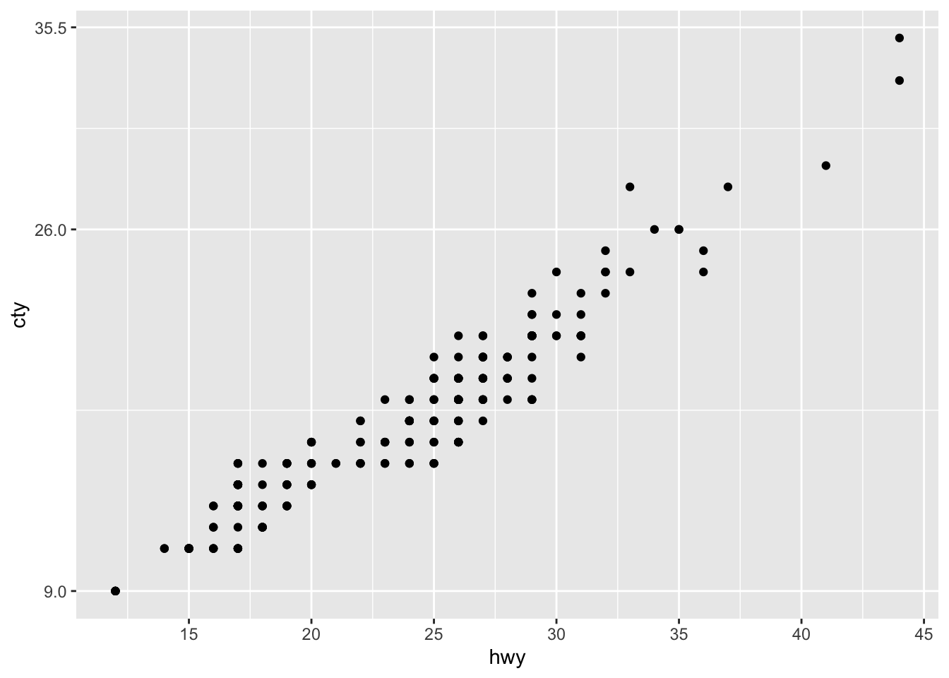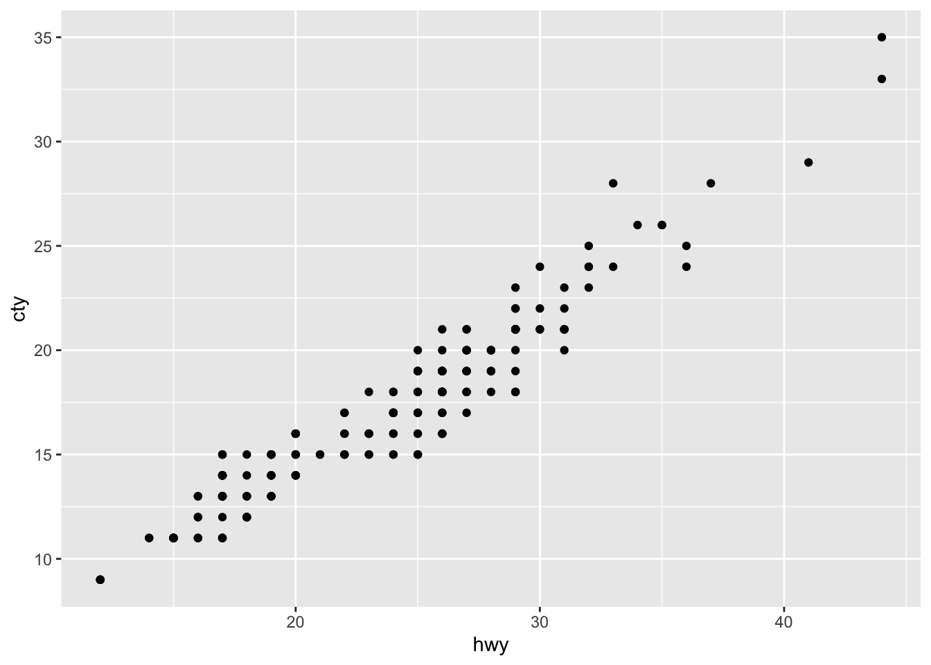 ggplot(mpg, aes(x = hwy, y = cty)) +