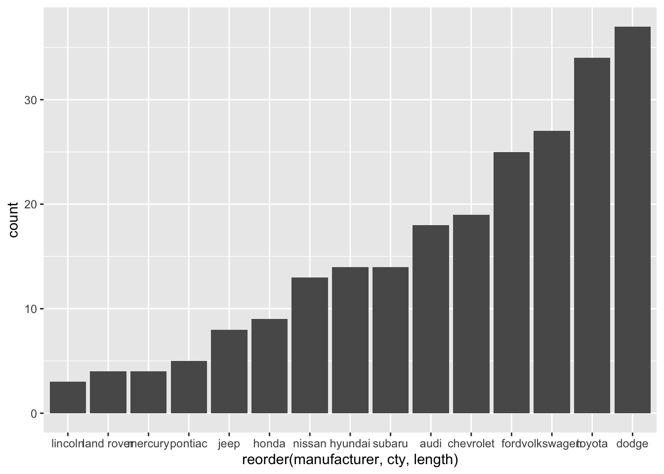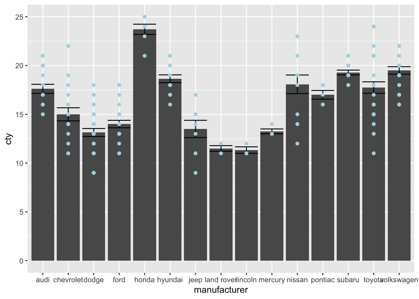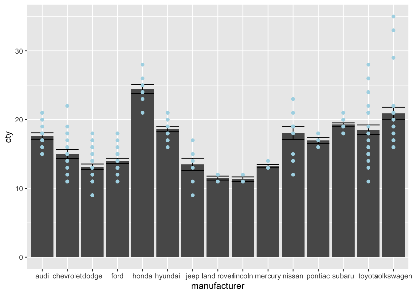 ggplot(mpg, aes(x = manufacturer, y = cty)) +