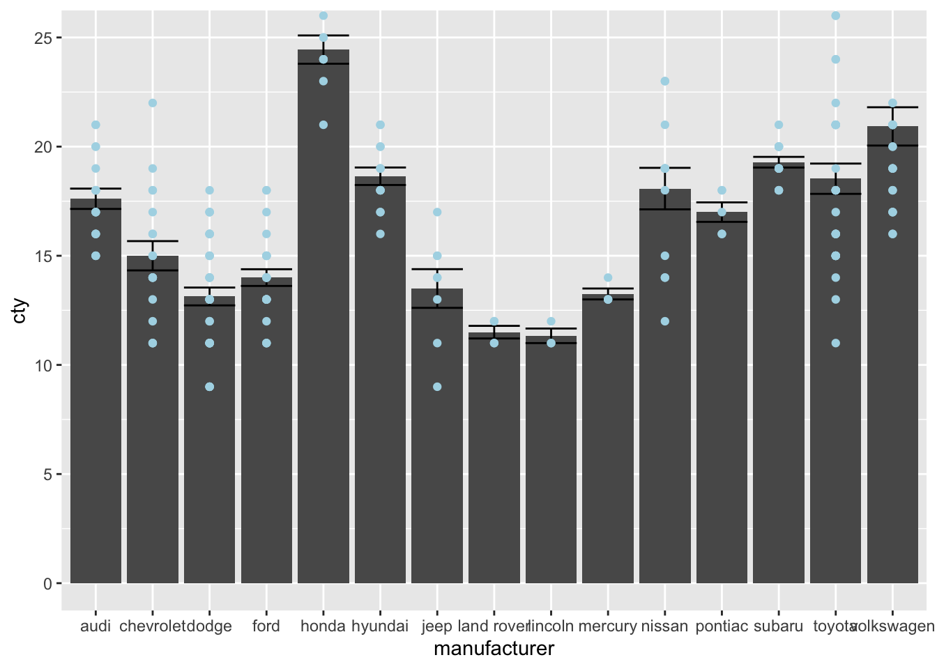 This is certainly not what we had in mind! We have changed our underlying data; all 8 datapoints that were larger than 25 were removed and then the data were plotted. Compare the bar and error for Honda and Volkswagen in the two graphs.