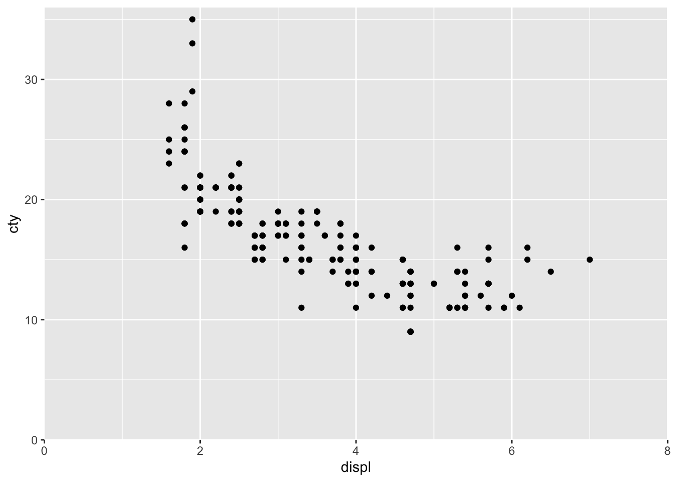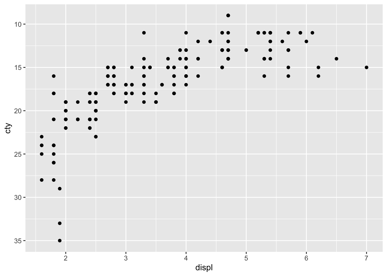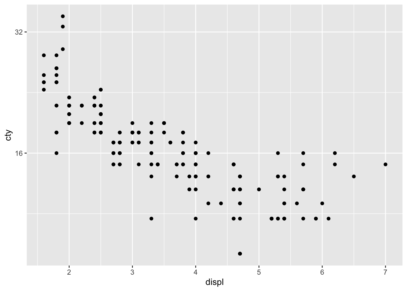 ggplot(mpg, aes(x = displ, y = cty)) +