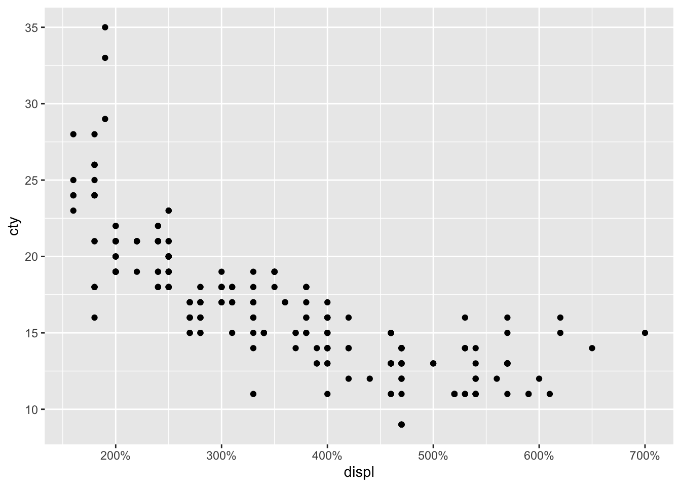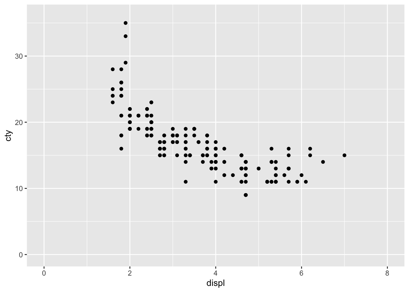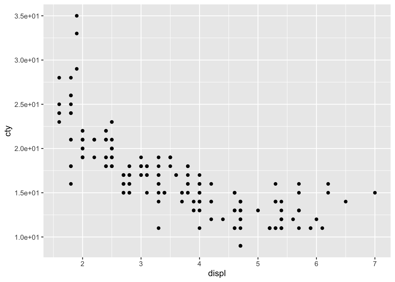 ggplot(mpg, aes(x = displ, y = cty)) +
