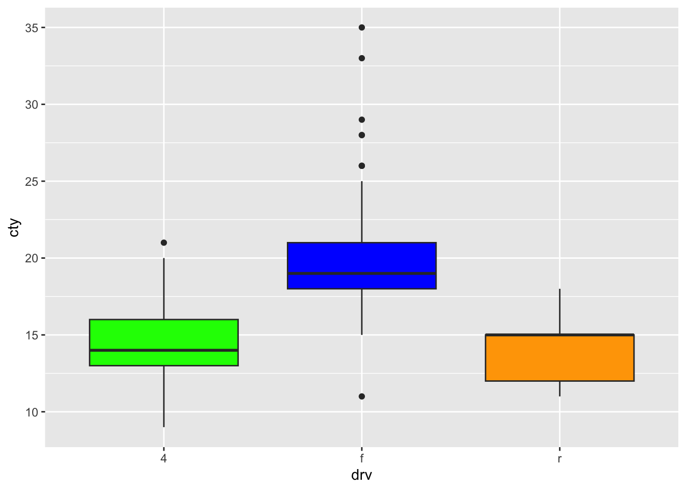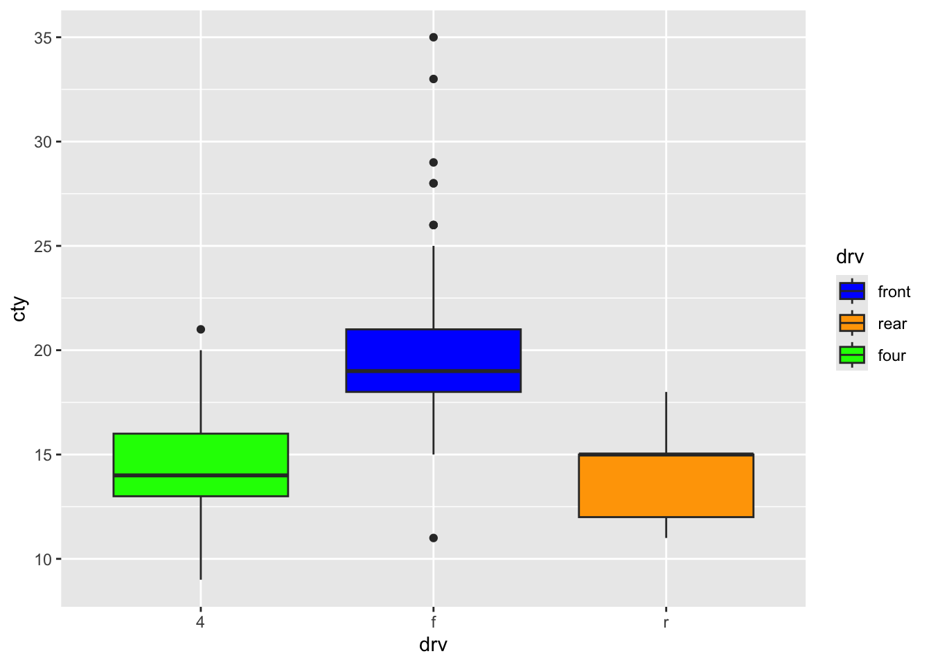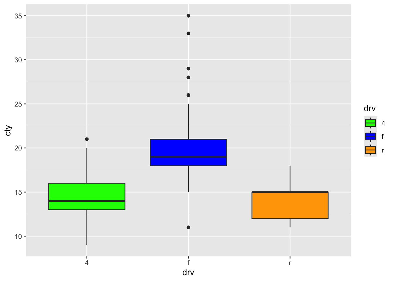 ggplot(mpg, aes(x = drv, y = cty, fill = drv)) +