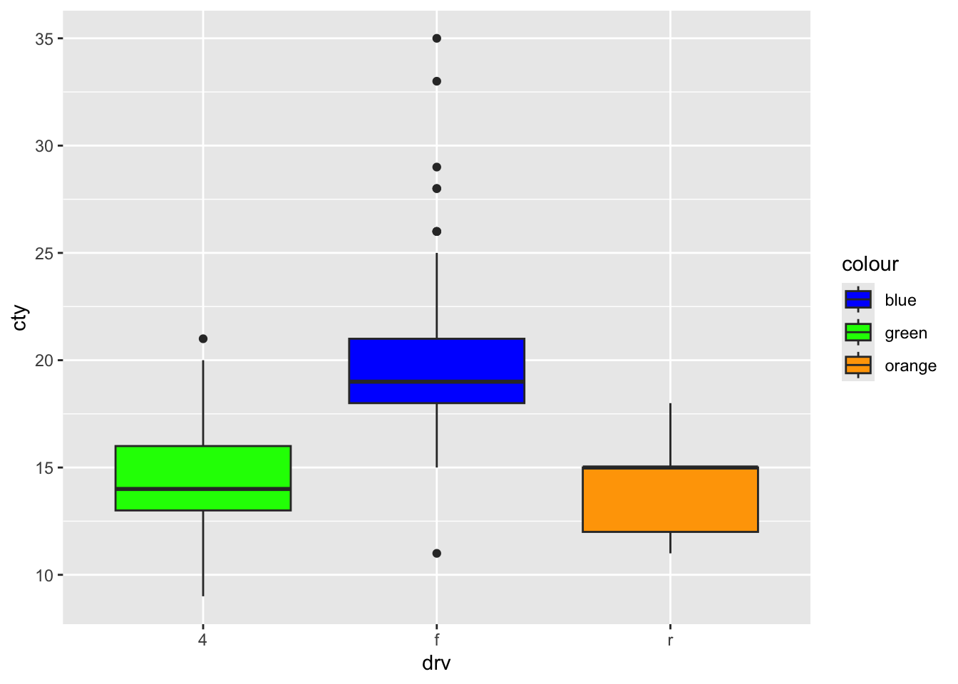 ggplot(mpg, aes(x = drv, y = cty, fill = colour)) +