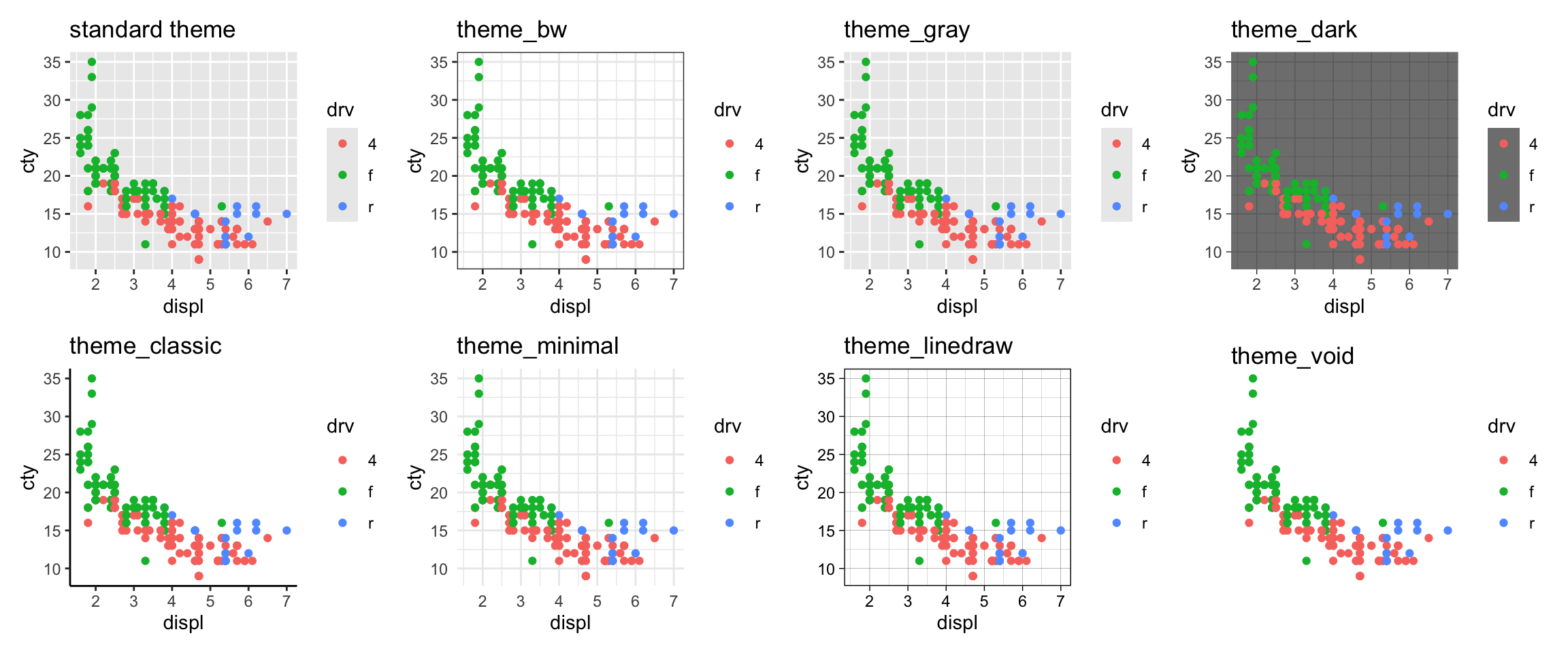 The standard themes of ggplot include: theme_bw, theme_gray, theme_dark, theme_classic, theme_minimal, theme_linedraw, theme_void
