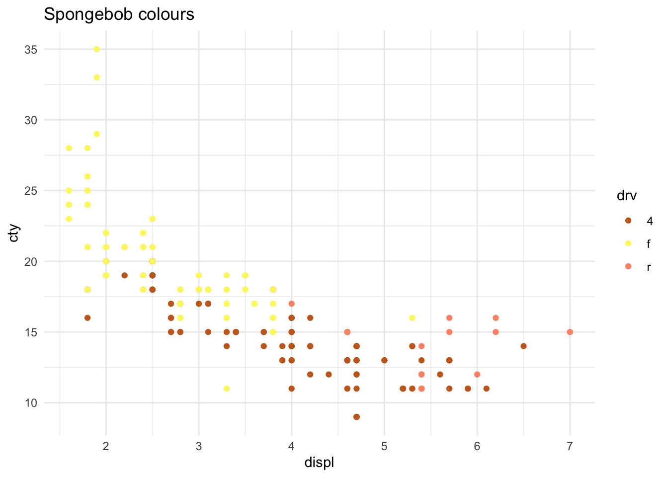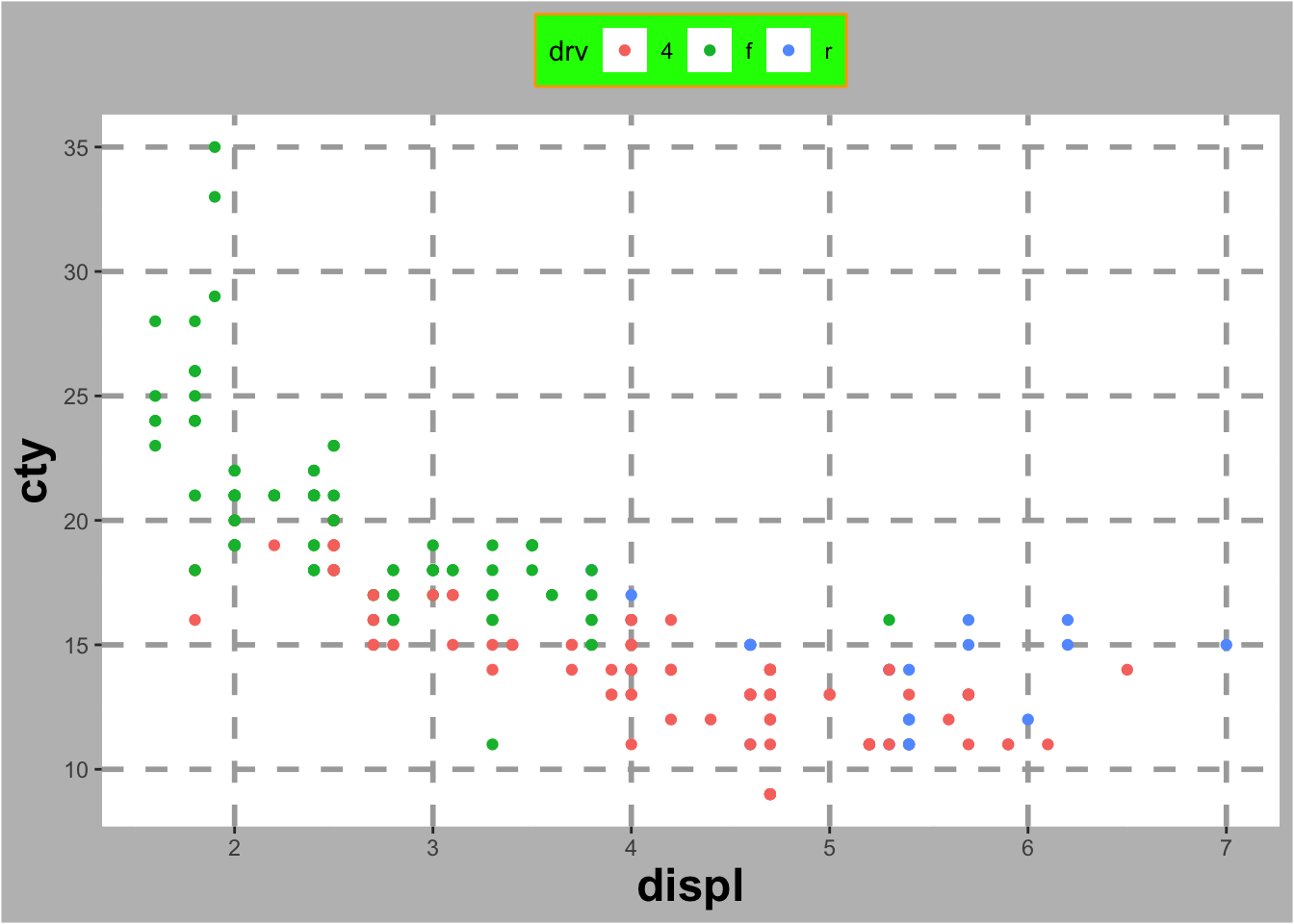 regular <- ggplot(mpg, aes(x = displ, y = cty, colour = drv)) + geom_point() +