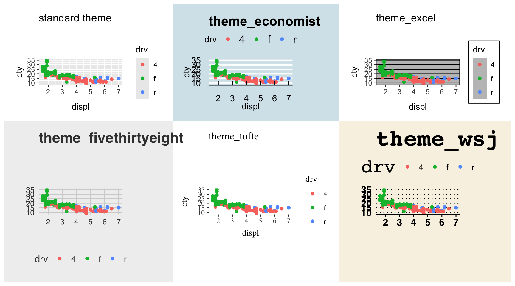 regular + econ + excel + fte + tufte + wsj + plot_layout(ncol = 3)